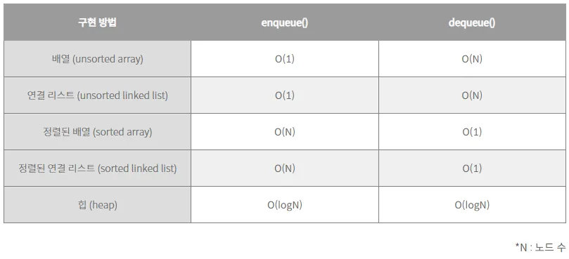 내부적으로 다양한 자료구조(힙, 연결 리스트, 배열)를 사용하여 구현될 수 있으나 효울성을 위해 주로 힙을 사용한다.