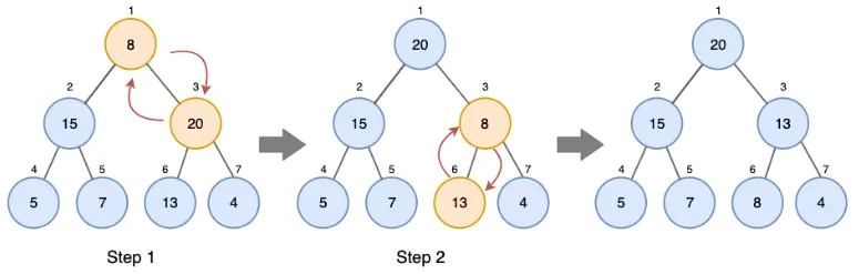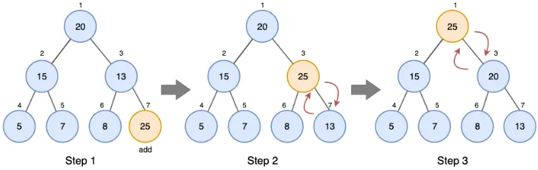 부모 노드와 비교하여 힙 속성을 위배하는 경우 부모 노드와 값을 바꾼다.