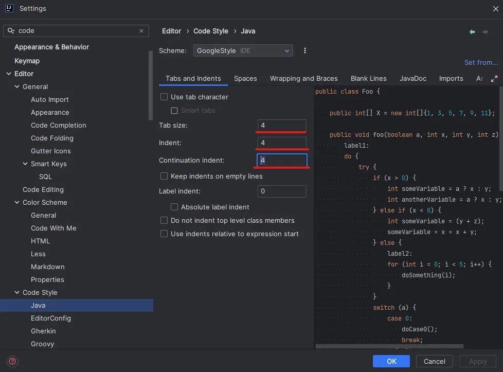 구글 스타일을 적용하되 indent는 4로 설정하여 작업한다