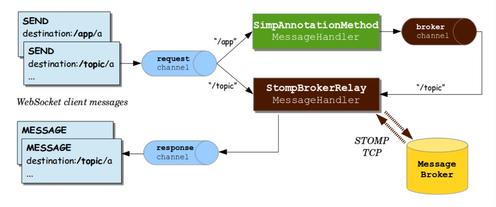 SimpleBroker는 해당하는 경로를 SUBSCRIBE하는 client에게 메시지를 전달하는 간단한 작업을 수행한다.