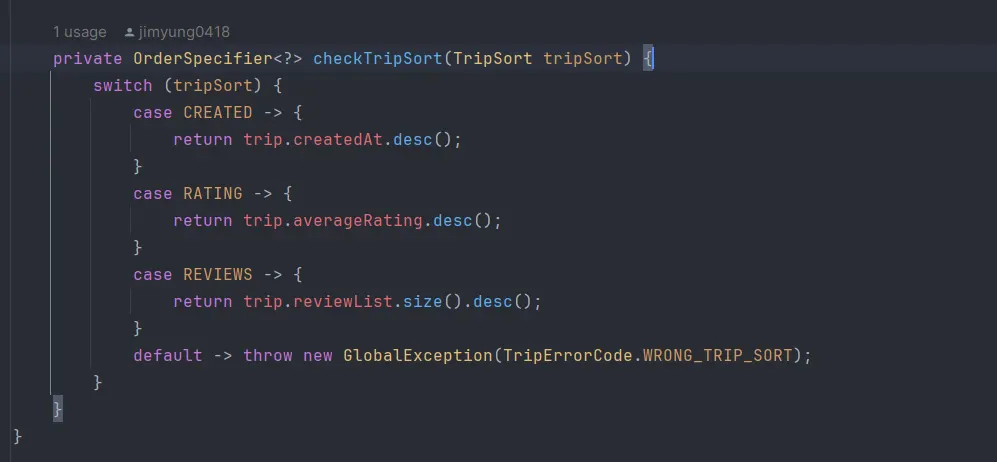 위 코드처럼 if문으로 조건을 비교해서 BooleanBuilder객체에 값을 넣어주고 이 객체를 WHERE절에 넘겨주면 조건문이 완성된다.
