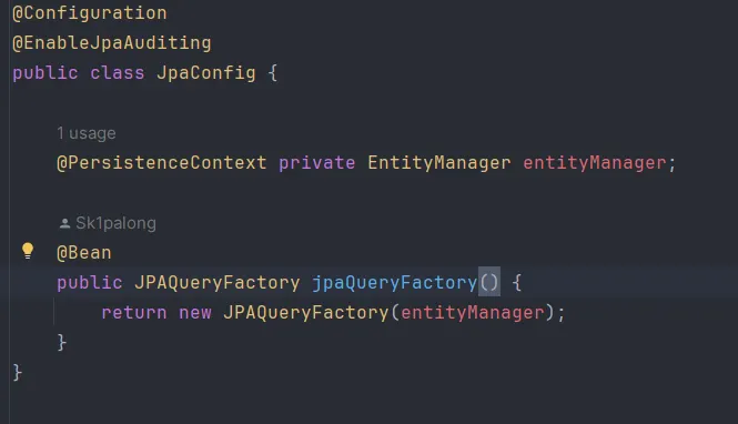 프로젝트 전역에서 QueryDSL을 사용할 수 있도록 JPAQueryFactory를 Bean으로 등록해준다.