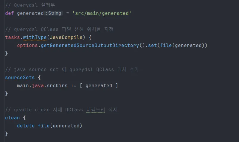 따라서, Q 클래스의 생성 위치를 소스셋에 포함된 디렉토리로 설정해두면, 빌드 시에 자동으로 Q 클래스를 인식하고 컴파일할 수 있게 됩니다. 이는 추가적으로 소스셋을 설정해주는 작업을 줄여주므로 편리합니다.