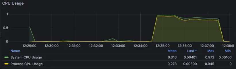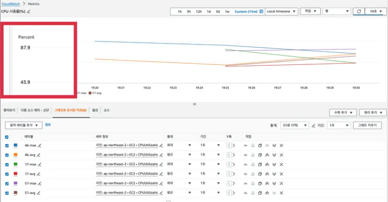 단일 EC2로 부하테스트 진행시 CPU사용량이 97%까지 올라갔지만오토스케일링 적용시에는 CPU사용량이 87%까지 올라가다가스케일 아웃 되어 43% 까지 떨어지는것을 확인할수 있었습니다.