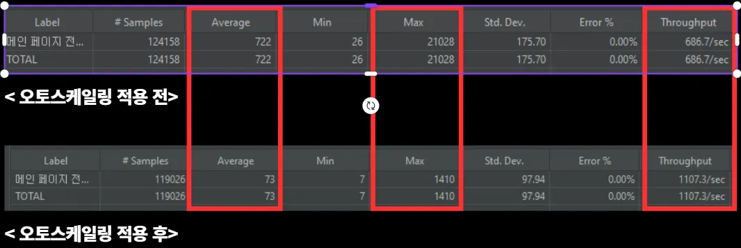 최대응답시간은 약14배 평균응답시간은 9배 처리량 또한 향상되었습니다