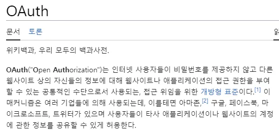 OAuth는 인터넷 사용자들이 비밀번호를 제공하지 않고 다른 웹사이트 상의 자신들의 정보에 대해 웹사이트나 애플리케이션의 접근 권한을 부여할 수 있는 공통적인 수단으로서 사용되는, 접근 위임을 위한 개방형 표준이다.