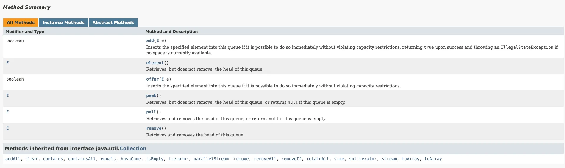 실제로 LinkedList 클래스에 큐 동작과 관련된 메서드를 지원함