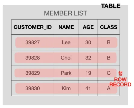 레코드는 행(row)에 해당하는 논리적으로 연관된 필드의 집합