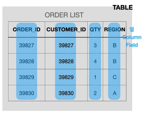 필드는 열(column)에 해당하는 가장 작은 단위의 데이터