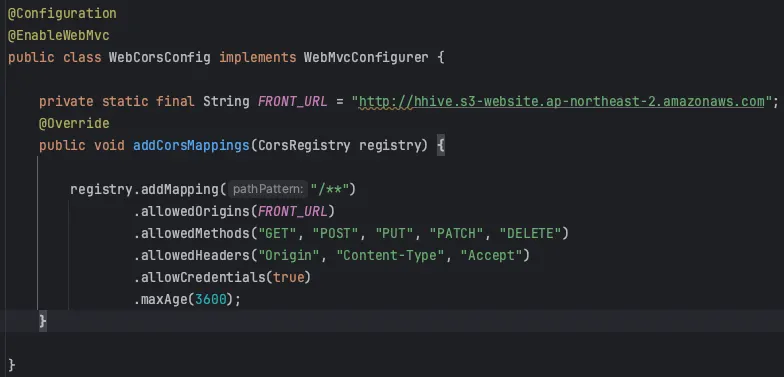 CORS 문제겠거니 해서 CORS 설정 스프링 코드에 추가함.