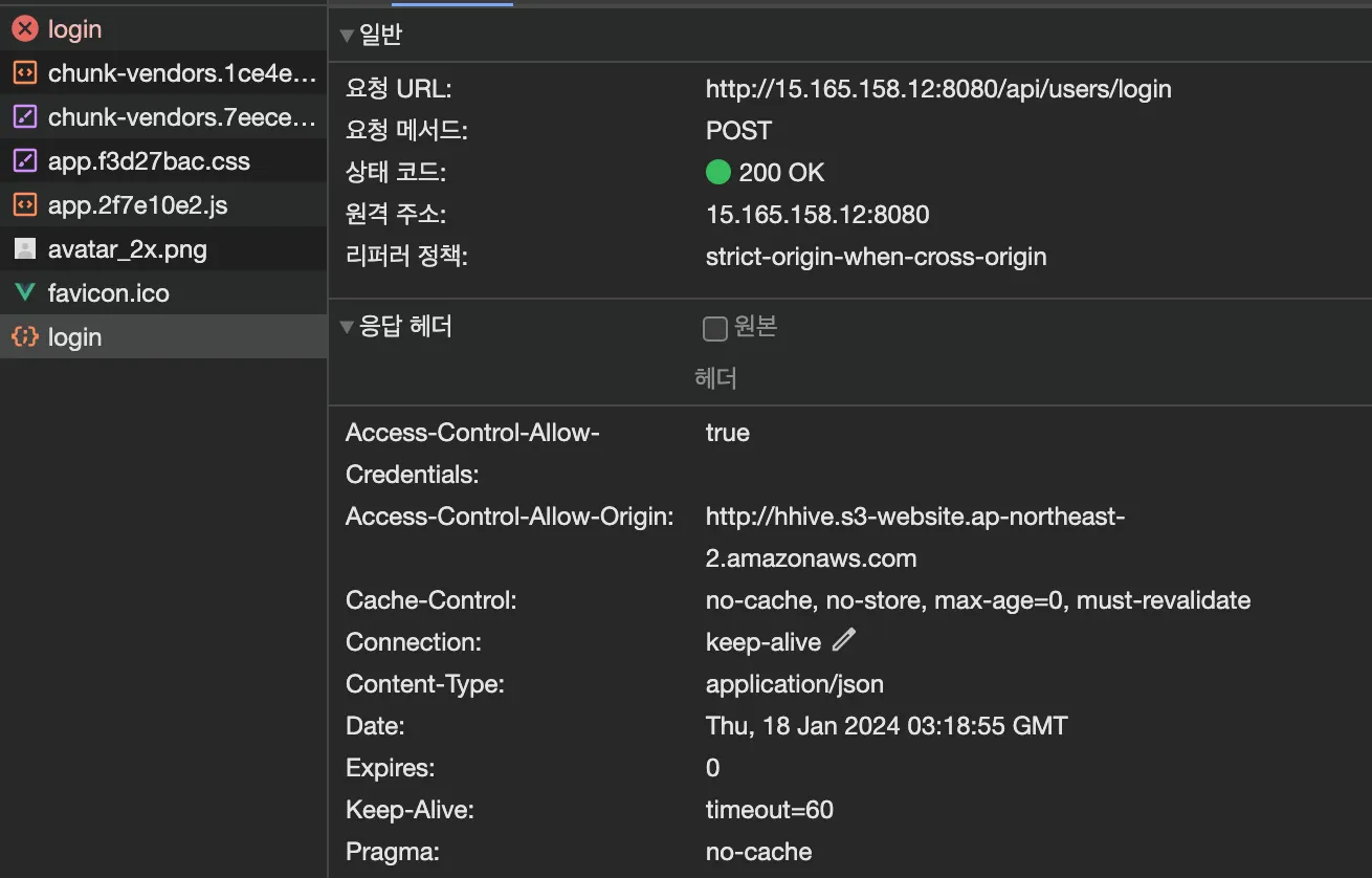 로그인 요청 잘 날라가고 200 메시지까지 받았고 그 안에 Set-cookie 도 잘 되어 있는데 브라우저 쿠키 저장소에 쿠키가 안 담김.