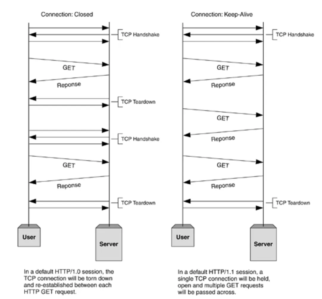 클라이언트와 서버는 각 요청과 응답에 대해 매번 새로운 TCP 연결을 생성하고 닫아야 합니다. 이 방식은 네트워크 리소스가 비효율적으로 사용됩니다. 반면 keep-alive를 사용하면 단일 TCP 연결에서 여러 요청과 응답이 이루어지기 때문에 네트워크 지연 시간이 줄어들고 웹 사이트 성능이 좋아집니다.
