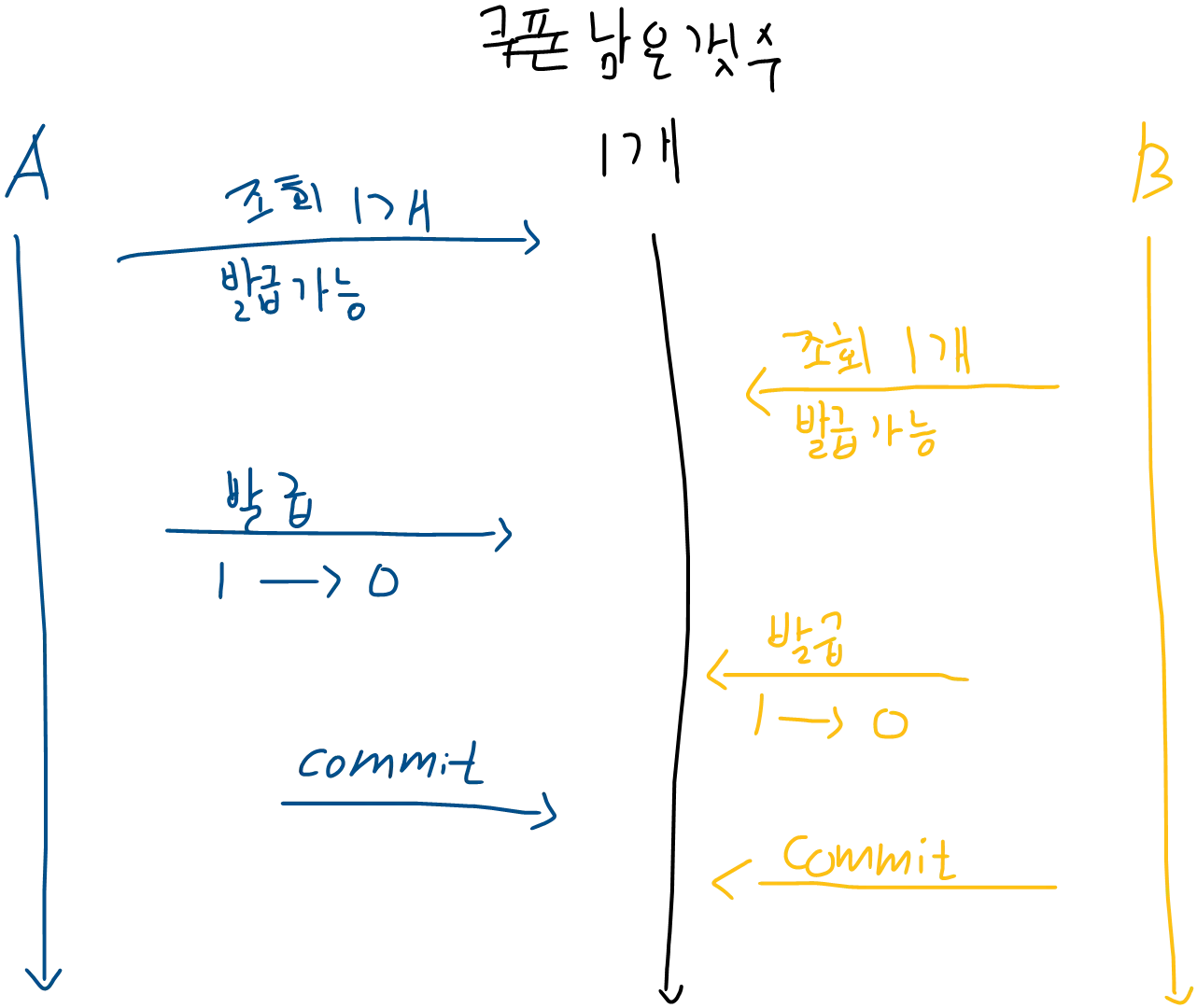 쿠폰의 남은 갯수가 1개이고, 사용자 A와 B가 동시에 쿠폰 발급을 진행하려 한다.(트랜잭션 격리수준은 mysql innoDB의 기본전략인 Repeatable Read를 전제로 진행합니다. 트랜잭션 격리수준에 대해 모른다면 꼭 찾아보세요.)