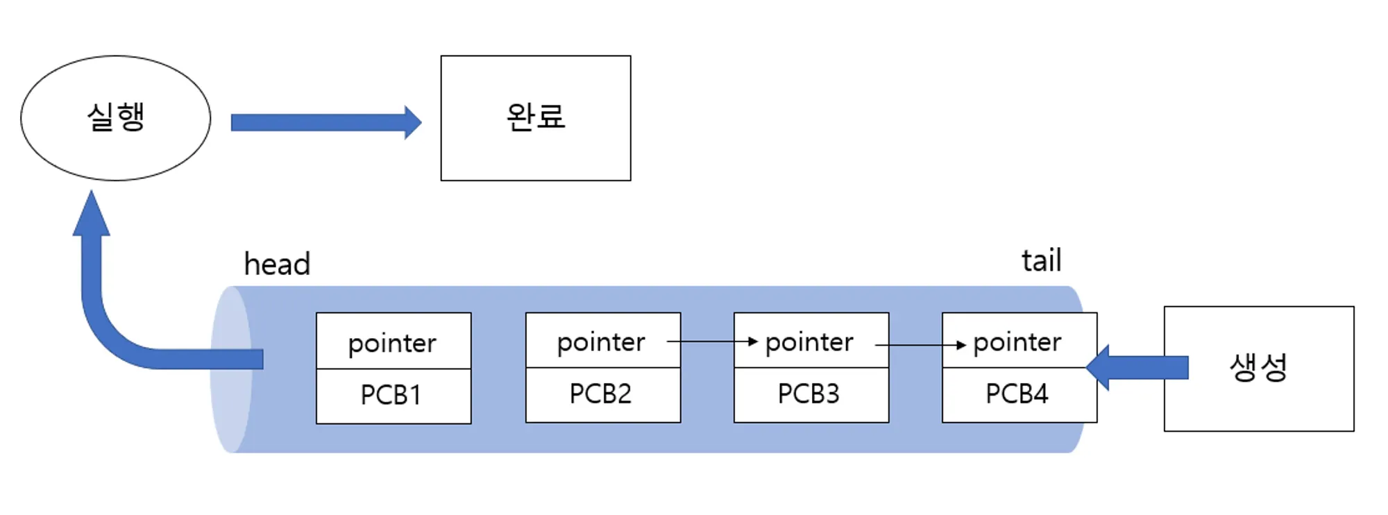 가장 먼저 온것을 가장먼저 처리하는 알고리즘으로 프로세스가 큐에 도착한 순서대로 실행되며, 한 번 실행되면 그 프로세스가 끝나야만 다음 프로세스를 실행시킬 수 있다. 큐가 하나이므로 모든 프로세스는 우선순위가 동일하다.