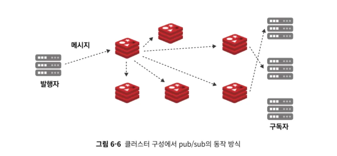 클러스터는 주로 대규모 서비스에서 데이터를 분석하고 저장하고 처리하기 위해 도입됐으며, 그렇기 때문에 Redis 클러스터 내에서 pub/sub을 사용할 때 메시지가 모든 Redis 노드에 복제되는 방식은 클러스터 환경의 핵심 목표와는 부합하지 않으며, 이로 인해 불필요한 리소스 사용과 네트워크 부하가 발생할 수 있다.