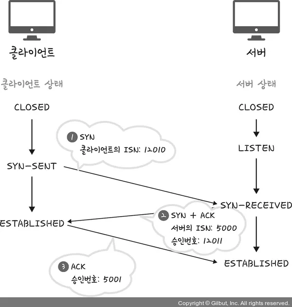 클라이언트 — ISN(첫 번째 패킷에 할당된 임의의 시퀀스번호) →서버