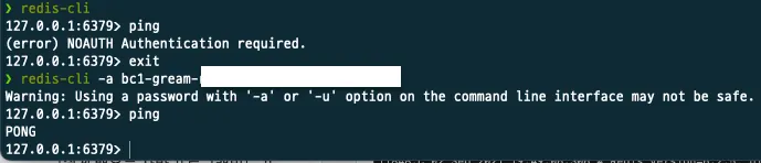 이제 터미널에 redis-cli 를 입력하고 ping 을 해보면 인증이 필요하다고 나오지만, -a <password> 를 추가하면 핑퐁이 되는 것을 볼 수 있다.