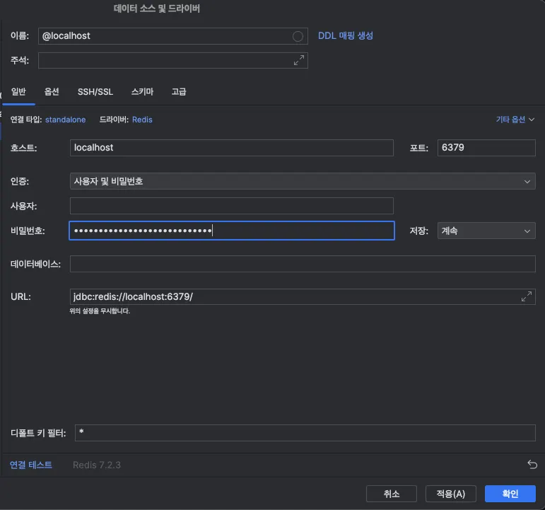 스프링에서는 application.yml 파일에 spring.data.redis.password 에다가 입력을 해주었고, 이를 위와 같이 호스트와 포트, 패스워드를 입력해주면 작동이 된다.