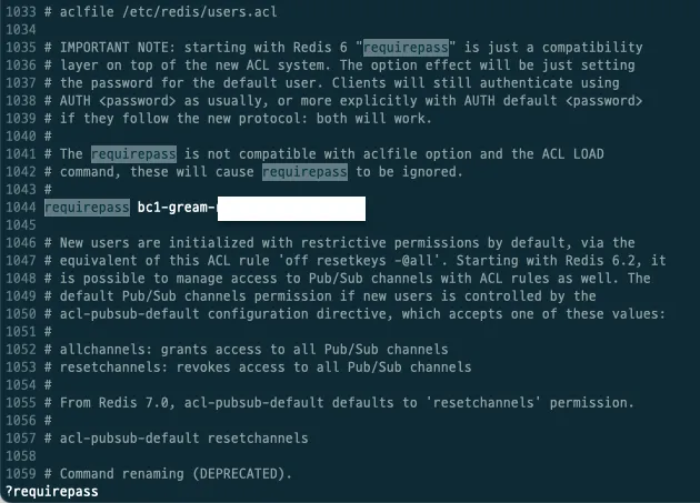 명령 모드에서 ?requirepass 입력 후 엔터 치면 1044줄 처럼 해당 단어의 위치로 이동한다.