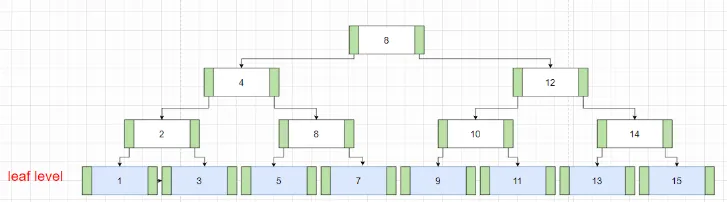 실제 데이터를 포함하며, 모든 리프 노드는 같은 레벨에 있다.