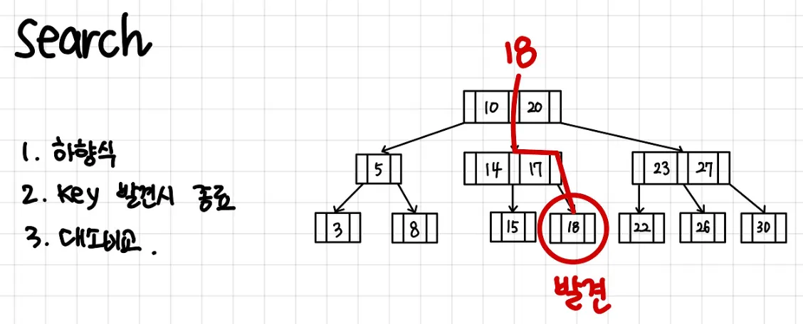 루트 노드부터 시작해 키 값을 비교하며 적절한 리프 노드로 내려간다.